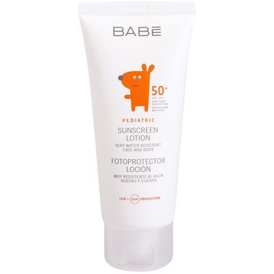 Сонцезахисний лосьйон з дуже високим фактором захисту SPF 50. Спеціально розроблений для захисту чутливої дитячої шкіри від шкідливого впливу сонця - UVA і UVB променів. Містить заспокійливий комплекс BABE на основі Алое і Ромашки, завдяки чому не тільки захищає шкіру від сонячних променів, але і має заспокійливу і зволожуючу дію. Не змивається водою. Містить органомінеральні, фізичні, хімічні та біологічні фільтри.