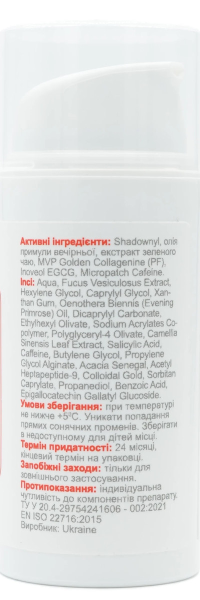 Активні інгредієнти: Shadownyl, олія примули вечірньої, екстракт зеленого чаю, MVP Golden Collagenine (PF), Inoveol EGCG, Micropatch Cafein