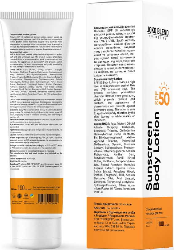 Активні компоненти сонцезахисного лосьйону для тіла SPF 50 Joko Blend 100 мл: