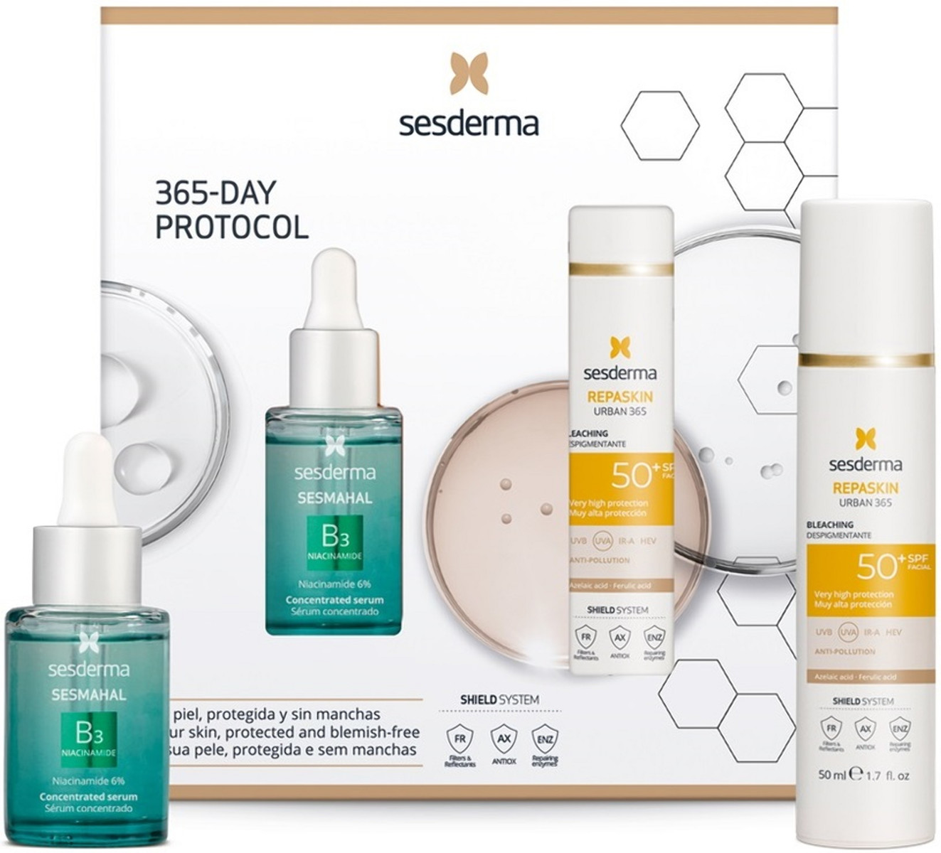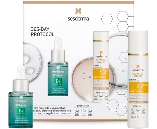Склад набору: Багатофункціональна концентрована сироватка з 6% ніацинаміду Sesderma Sesmahal B3, 30 ml + Депігментуючий сонцезахисний крем для обличчя Sesderma Repaskin Urban 365, 50 ml