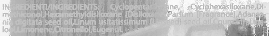 Склад: Cyclopentasiloxane, Cyclohexasiloxane, Dimethiconol, Parfum, Adansonia digitata seed oil, Linum usitatissimum oil,Coumarin, Linalool, Limonene, Eugenol, Citronellol.