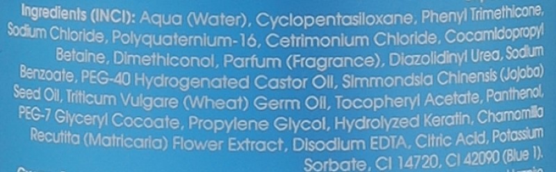 Склад: Aqua (Water), Cyclopentasiloxane, Phenyl Trimethicone, Sodium Chloride, Polyquaternium-16, Cetrimonium Chloride, Cocamidopropyl Betaine, Dimethiconol, Parfum (Fragrance), Diazolidinyl Urea, Sodium Benzoate, PEG-40 Hydrogenated Castor Oil, Simmondsia Chinensis (Jojoba) Seed Oil, Triticum Vulgare (Wheat) Germ Oil, Tocopheryl Acetate, Panthenol, PEG-7 Glyceryl Cocoate, Propylene Glycol, Hydrolyzed Keratin, Chamomilla Recutita (Matricaria) Flower Extract, Disodium EDTA, Citric Acid, Potassium Sorbate, CI 14720, CI 42090 (Blue 1)