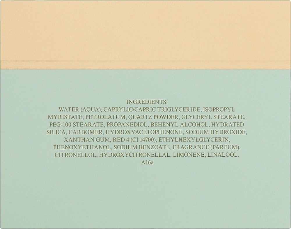 Склад: Water (Aqua), Caprylic/Capric Triglyceride, Isopropyl Myristate, Isocetyl Stearoyl Stearate, Propylene Glycol, Cellulose Acetate, Glyceryl Stearate, Peg-100 Stearate, 1,2-Hexanediol, Behenyl Alcohol, Butyrospermum Parkii (Shea) Butter, Polyglycerin-3, Helianthus Annuus (Sunflower) Seed Oil, Tocopherol, Carbomer, Sodium Hydroxide, Xanthan Gum, Ethylhexylglycerin, Phenoxyethanol, Fragrance (Parfum), Citronellol, Hydroxycitronellal, Limonene, Linalool