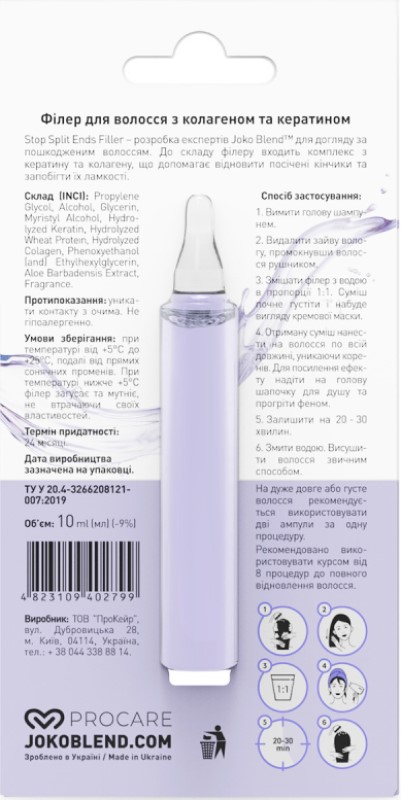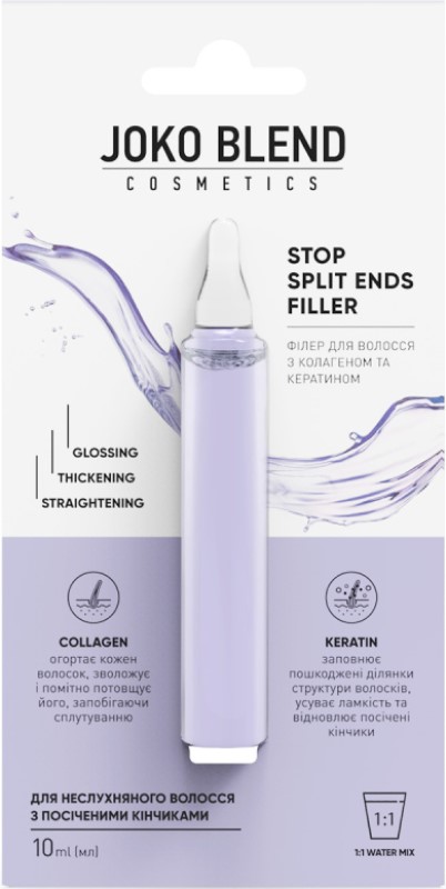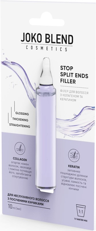 - Філер для волосся з колагеном та кератином Stop Split Ends Filler Joko Blend™ - це інноваційна доглядова процедура, яку легко можна зробити в домашніх умовах. Активні компоненти заповнюють пошкоджені ділянки структури волосся і помітно потовщують їх, попереджуючи сплутуванню.