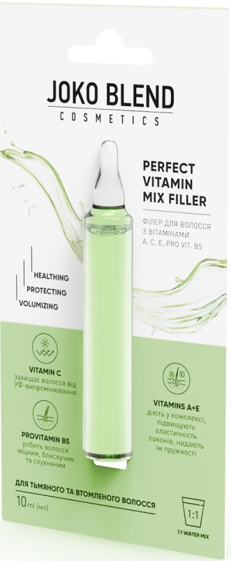 Perfect Vitamin Mix Filler – розробка експертів Joko Blend™ для наповнення тусклого волосся життєвою силою, придання локонам блиску та м'якості. До складу філеру входить комплекс з 4-х вітамінів, який швидко проникає в глибокі шари волосся, впливаючи на нього зсередини. Вже після першого застосування волосся стає пружним, міцним та шовковистим!