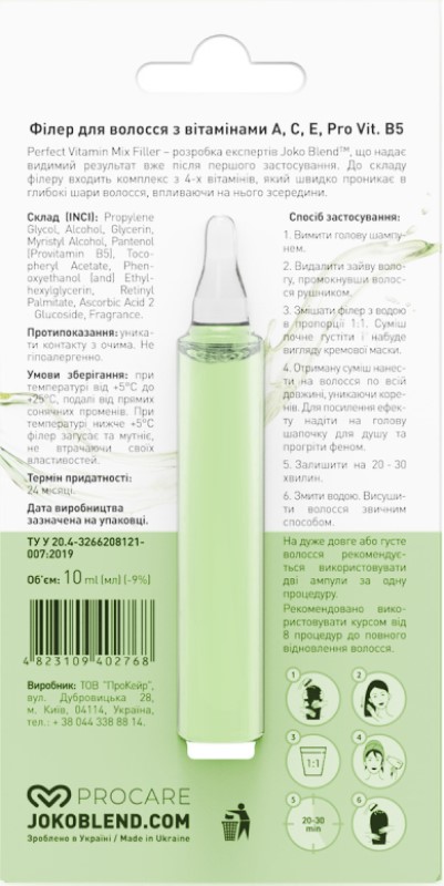 - Філер для волосся з вітамінами А, С, Е, Pro Vit. В5 Perfect Vitamin Mix Filler Joko Blend™ - це інноваційна доглядова процедура, яку легко можна зробити в домашніх умовах. Засіб створено для тьмяного та втомленого типу волосся, що насичує його комплексом вітамінів.