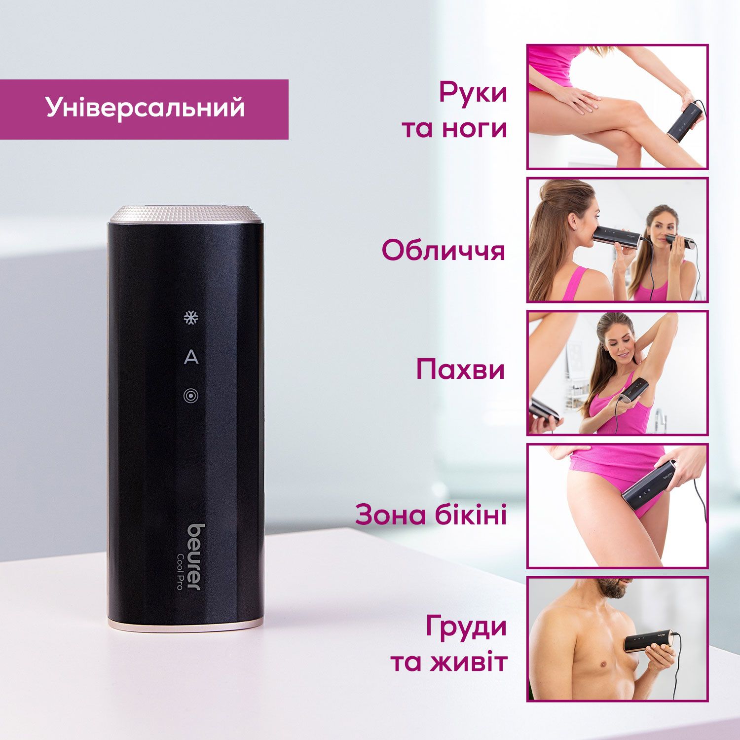 IPL епілятор Beurer з функцією охолодження для безболісного та ефективного видалення волосся. Сучасна технологію інтенсивного імпульсного світла (IPL) для деактивації коренів волосся глибоко під шкірою. Лише через 3–4 застосування помітне зменшення кількості волосся на 50%. До 1 мільйона світлових імпульсів для багаторічного користування без заміни лампи. Завдяки великій світловій зоні 3,8 см², дозволяє швидко обробляти руки, ноги, обличчя, пахви і зону бікіні всього за 23 хвилини. П'ять рівнів інтенсивності дозволяють налаштовувати прилад для різних типів шкіри та волосся. Епілятор пройшов клінічні випробування, має датчик контакту зі шкірою та вбудований УФ-фільтр для захисту шкіри.