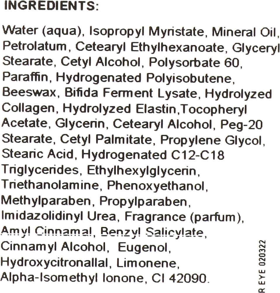 Склад: Water (Aqua), Isopropyl Myristate, Mineral Oil, Petrolatum, Cetearyl Ethylhexanoate, Glyceryl Stearate, Cetyl Alcohol, Polysorbate 60, Paraffin, Hydrogenated Polyisobutene, Beeswax, Bifida Ferment Lysate, Hydrolyzed Collagen, Hydrolyzed Elastin, Tocopheryl Acetate, Glycerin, Cetearyl Alcohol , Peg-20 Stearate, Cetyl Palmitate, Propylene Glycol, Stearic Acid, Hydrogenated C12-C18 Triglycerides, Ethylhexylglycerin, Triethanolamine, Phenoxyethanol, Methylparaben, Propylparaben, Imidazolidinyl Urea, Fragrance (Parfum), Amyl Cinnamal, Benzyl Salicylate, Cinnamyl Alcohol, Eugenol, Hydroxycitronallal, Limonene, Alpha-Isomethyl Ionone, Ci 42090.