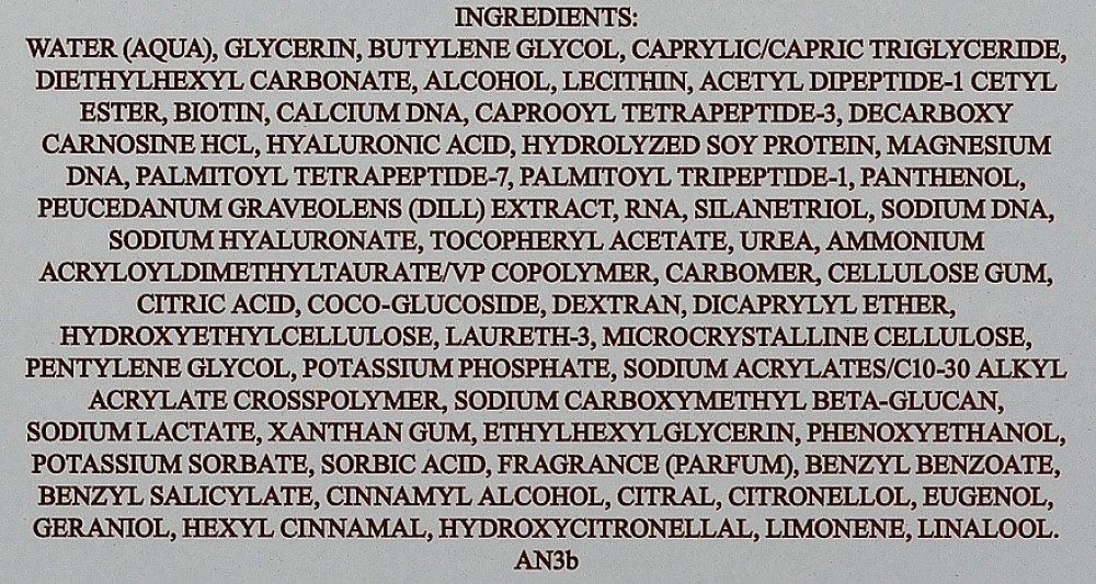 Склад: Water (Aqua), Glycerin, Butylene Glycol, Caprylic/capric Triglyceride, Diethylhexyl Carbonate, Alcohol, Lecithin, Acetyl Dipeptide-1 Cetyl Ester, Calcium Dna, Caprooyl Tetrapeptide-3, Decarboxy Carnosine Hcl, Hydrolyzed Soy Protein, Magnesium Dna, Palmitoyl Tetrapeptide-7, Palmitoyl Tripeptide-1, Panthenol, Peucedanum Graveolens (Dill) Extract, Rna, Silanetriol, Sodium Dna, Sodium Hyaluronate, Tocopheryl Acetate, Urea, Ammonium Acryloyldimethyltaurate/vp Copolymer, Carbomer, Cellulose Gum, Citric Acid, Coco-glucoside, Dextran, Dicaprylyl Ether, Hydroxyethylcellulose, Laureth-3, Microcrystalline Cellulose, Pentylene Glycol, Potassium Phosphate, Sodium Acrylates/C10-30 Alkyl Acrylate Crosspolymer, Sodium Carboxymethyl Beta-glucan, Sodium Lactate, Xanthan Gum, Ethylhexylglycerin, Phenoxyethanol, Potassium Sorbate, Sorbic Acid, Fragrance (Parfum), Benzyl Benzoate, Butylphenyl Methylpropional, Cinnamyl Alcohol, Citral, Citronellol, Eugenol, Geraniol, Hexyl Cinnamal, Hydroxyisohexyl 3- cyclohexene Carboxaldehyde, Limonene, Linalool