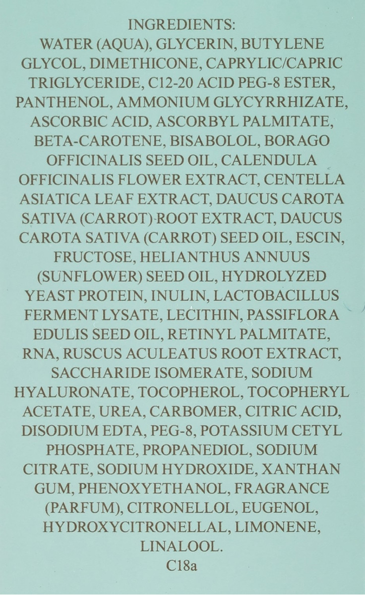 Склад: Water, Glycerin, Butylene Glycol, Dimethicone, Caprylic/Capric Triglyceride, C12-20 Acid PEG-8 Ester, Panthenol, Ammonium Glycyrrhizate, Ascorbic Acid, Ascorbyl Palmitate, Beta-Carotene, Bisabolol, Borago Officinalis Seed Oil, Calendula Officinalis Flower Extract, Centella Asiatica Leaf Extract, Daucus Carota Sativa (Carrot) Root Extract, Daucus Carota Sativa (Carrot) Seed Oil, Escin, Fructose, Helianthus Annuus (Sunflower) Seed Oil, Hydrolyzed Yeast Protein, Inulin, Lactobacillus Ferment Lysate, Lecithin, Passiflora Edulis Seed Oil, Retinyl Palmitate, RNA, Ruscus Aculeatus Root Extract, Saccharide Isomerate, Sodium Hyaluronate, Tocopherol, Tocopheryl Acetate, Urea, Carbomer, Citric Acid, Disodium EDTA, PEG-8, Potassium Cetyl Phosphate, Propanediol, Sodium Citrate, Sodium Hydroxide, Xanthan Gum, Phenoxyethanol, Fragrance (Parfum), Citronellol, Eugenol, Hydroxycitronellal, Limonene