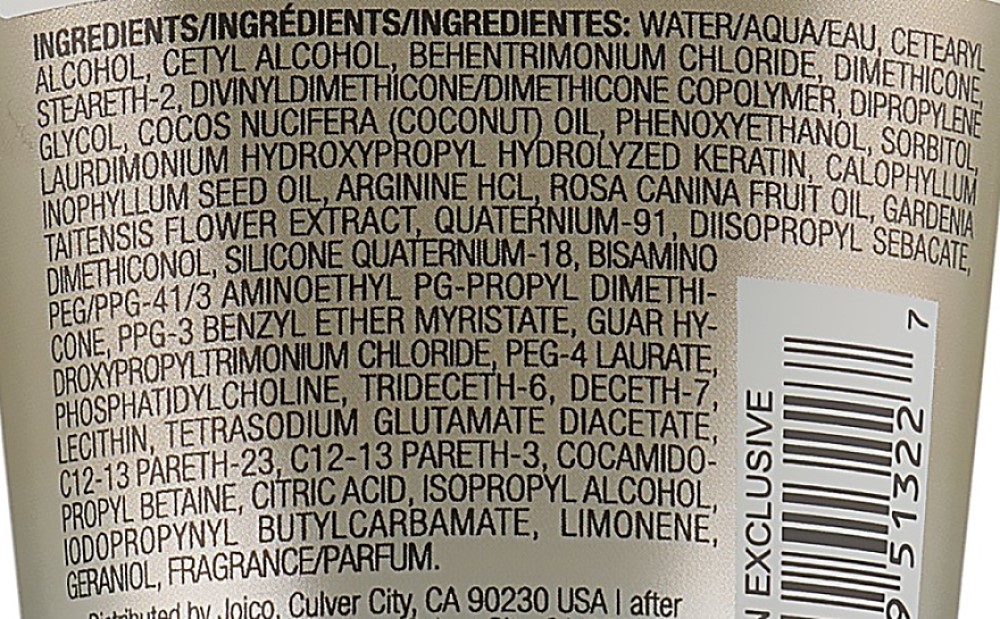 Склад: Water, Cetearyl Alcohol, Cetyl Alcohol, Behentrimonium Chloride, Dimethicone, Steareth-2, Divinyldimethicone/Dimethicone Copolymer, Dipropylene Glycol, Coconut Oil, Phenoxyethanol, Sorbitol, Hydrolyzed Keratin, Calophyllum Inophyllum Seed Oil, Arginine HCL, Rosa Canina Fruit Oil, Gardenia Taitensis Flower Extract, Quaternium-91, Diisopropyl Sebacate, Dimethiconol, Silicone Quaternium-18, Bisamino PEG/PPG-41/3 Aminoethyl PG-Propyl Dimethicone, PPG-3 Benzyl Ether Myristate, Guar Hydroxypropyltrimonium Chloride, PEG-4 Laurate, Phosphatidylcholine, Trideceth-6, Deceth-7, Lecithin, Tetrasodium Glutamate Diacetate, C12-13 Pareth-23, C12-13 Pareth-3, Cocamidopropyl Betaine, Citric Acid, Isopropyl Alcohol, Iodopropynyl Butylcarbamate, Limonene, Geraniol, Fragrance.