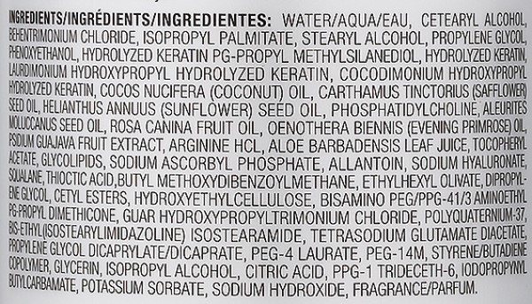 Склад: Water/Aqua/Eau, Cetearyl Alcohol, Behentrimonium Chloride, Isopropyl Palmitate, Stearyl Alcohol, Propylene Glycol, Phenoxyethanol, Hydrolyzed Keratin Pg-Propyl Methylsilanediol, Hydrolyzed Keratin, Laurdimonium Hydroxypropyl Hydrolyzed Keratin, Cocodimonium Hydroxypropyl Hydrolyzed Keratin, Cocos Nucifera (Coconut) Oil, Carthamus Tinctorius (Safflower) Seed Oil, Helianthus Annuus (Sunflower) Seed Oil, Phosphatidylcholine, Aleurites Moluccanus Seed Oil, Rosa Canina Fruit Oil, Oenothera Biennis (Evening Primrose) Oil, Fsdium Guajava Fruit Extract, Arginine Hcl, Aloe Barbadensis Leaf Juice, Tocopheryl Acetate, Glycolipids, Sodium Ascorbyl Phosphate, Allantoin, Sodium Hyaluronate, Soxualane, Thioctic Acid, Butyl Methoxydibenzoylmethane, Ethylhexyl Olivate, Dipropylene Glycol, Cetyl Esters, Hydroxyethylcellulose, Bisamino Peg/Ppg-41/3 Aminoethyl Pg-Propyl Dimethicone, Guar Hydroxypropyltrimonium Chloride, Polyquaternium-37, Bs-Ethyl (Isostearylimidazoline) Isostearamide, Tetrasodium Glutamate Diacetate, Propylene Glycol Dicaprylate/Dicaprate, Peg-4 Laurate, Peg-14m, Styrene/Butadiene Copolymer, Glycerin, Isopropyl Alcohol, Citric Acid, Ppg-1 Trideceth-6, Iodopropynyl Butylcarbamate, Potassium Sorbate, Sodium Hydroxide, Fragrance/Parfum.