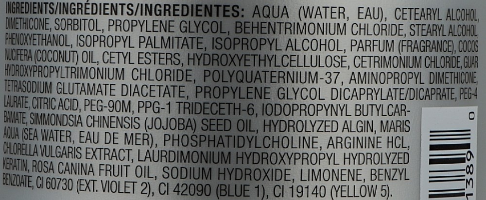 Склад: Aqua (Water), Cetearyl Alcohol, Dimethicone, Sorbitol, Propylene Glycol, Behentrimonium Chloride, Stearyl Alcohol, Phenoxyethanol, Isopropyl Palmitate, Isopropyl Alcohol, Parfum (Fragrance), Cocos Nucifera (Coconut) Oil, Cetyl Esters, Hydroxyethylcellulose, Cetrimonium Chloride, Guar Hydroxypropyltrimonium Chloride, Polyquaternium-37, Aminopropyl Dimethicone, Tetrasodium Glutamate Diacetate, Propylene Glycol Dicaprylate/Dicaprate, PEG-4 Laurate, Citric Acid, PEG-90M, PPG-1 Trideceth-6, Iodopropynyl Butylcarbamate, Simmondsia Chinensis (Jojoba) Seed Oil, Hydrolyzed Algin, Maris Aqua (Sea Water), Phosphatidylcholine, Arginine HCL, Chlorella Vulgaris Extract, Laurdimonium Hydroxypropyl Hydrolyzed Keratin, Rosa Canina Fruit Oil, Sodium Hydroxide, Limonene, Benzyl Benzoate, CI 60730 (Ext. Violet 2), CI 42090 (Blue 1), CI 19140 (Yellow 5)
