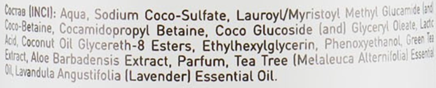Склад: Aqua (Water), Sodium Cocoyl Isethionate, Cocamidopropyl Betaine, Coco-Glucoside, Glycerin, Disodium Laureth Sulfosuccinate, Lactic Acid, Inulin, Alpha-Glucan Oligosaccharide, Aloe Barbadensis Leaf Extract, Camellia Sinensis (Green Tea) Leaf Extract, Orchid Extract, Propylene Glycol, PEG/PPG-120/10 Trimethylolpropane Trioleate, Laureth-2, Sodium Chloride, Sodium Benzoate, Potassium Sorbate, Parfum (Fragrance), Citric Acid.