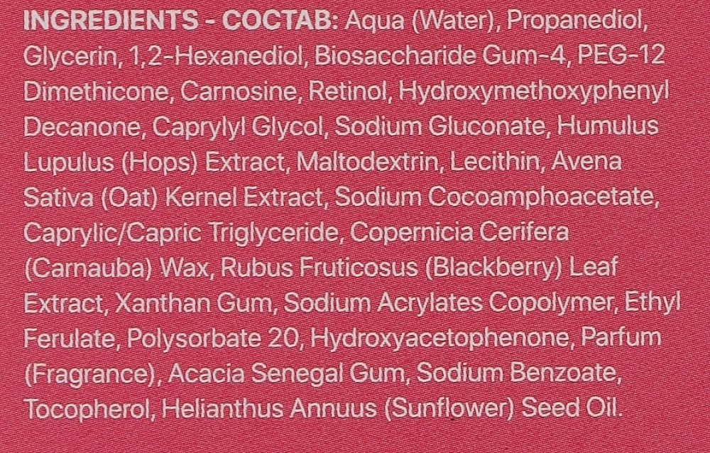 Склад: Aqua (Water), Propylene Glycol, Glycerin, Biosaccharide Gum-4, PEG-12 Dimethicone, Carnosine, Retinol, Caprylyl Glycol, Lactic Acid, Ethylhexylglycerin, Tocopheryl Acetate, Copernicia Cerifera Cera (Carnauba Wax), PEG-8, Maltodextrin, Lecithin, Avena Sativa (Oat) Kernel Extract, Sodium Cocoamphoacetate, 1,2-Hexanediol, Rubus Fruticosus (Blackberry) Leaf Extract, Xanthan Gum, Tocopherol, Ascorbic Acid, Sodium Acrylates Copolymer, Propanediol, Citric Acid, Parfum (Fragrance), BHT, Ascorbyl Palmitate, BHA, Triethylene Glycol, Phenoxyethanol, Phenethyl Alcohol.