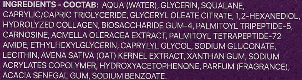 Склад: Aqua (water), glycerin, squalane, caprylic/capric triglyceride, glyceryl oleate citrate, hydrolyzed collagen, biosaccharide gum-4, palmitoyl tripeptide-5, carnosine, acmella oleracea extract, palmitoyl tetrapeptide-72 amide, caprylyl glycol, ethylhexylglycerin, lecithin, avena sativa (oat) kernel extract, xanthan gum, sodium acrylates copolymer, 1,2-hexanediol, disodium edta, parfum (fragrance), triethylene glycol, phenoxyethanol, phenethyl alcohol.
