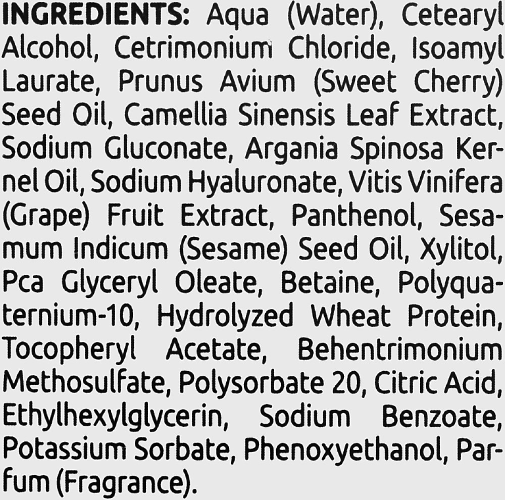 Склад: Aqua (Water), Cetearyl Alcohol, Cetrimonium Chloride, Isoamyl Laurate, Prunus Avium (Sweet Cherry) Seed Oil, Camellia Sinensis Leaf Extract, Sodium Gluconate, Argania Spinosa Kernel Oil, Sodium Hyaluronate, Vitis Vinifera (Grape) Fruit Extract, Panthenol, Sesamum Indicum (Sesame) Seed Oil, Xylitol, Pca Glyceryl Oleate, Betaine, Polyquaternium-10, Hydrolyzed Wheat Protein, Tocopheryl Acetate, Behentrimonium Methosulfate, Polysorbate 20, Citric Acid, Ethylhexylglycerin, Sodium Benzoate, Potassium Sorbate, Phenoxyethanol, Parfum (Fragrance)