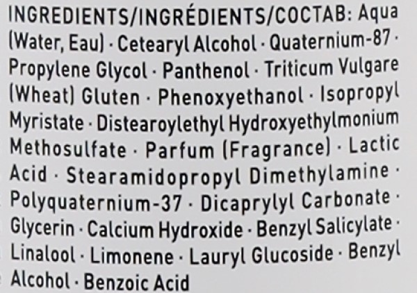 Склад: Aqua (Water, Eau), Cetearyl Alcohol, Quaternium-87, Propylene Glycol, Distearoylethyl Hydroxyethylmonium Methosulfate, Stearamidopropyl Dimethylamine, Polyquaternium-37, Hydrolyzed Silk, Calcium Hydroxide, Lactic Acid, Benzophenone-4, Isopropyl Myristate, Hydrolyzed Keratin, Steardimonium Hydroxypropyl Hydrolyzed Keratin, Panthenol, Phenoxyethanol, Sodium Methylparaben, Parfum (Fragrance), Dicaprylyl Carbonate, Benzyl Salicylate, Butylphenyl Methylpropional, Linalool, Limonene, Lauryl Glucoside, Butylene Glycol, CI 17200 (Red 33).