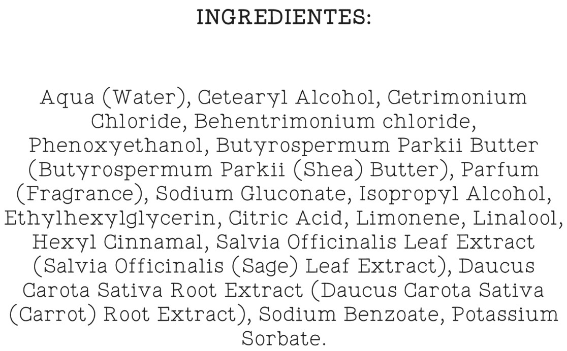 Склад: Aqua (Water), Cetearyl Alcohol, Cetrimonium Chloride, Behentrimonium chloride, Phenoxyethanol, Butyrospermum Parkii Butter (Butyrospermum Parkii (Shea) Butter), Parfum (Fragrance), Sodium Gluconate, Isopropyl Alcohol, Ethylhexylglycerin, Citric Acid, Limonene, Linalool, Hexyl Cinnamal, Salvia Officinalis Leaf Extract (Salvia Officinalis (Sage) Leaf Extract), Daucus Carota Sativa Root Extract (Daucus Carota Sativa (Carrot) Root Extract), Sodium Benzoate, Potassium Sorbate.