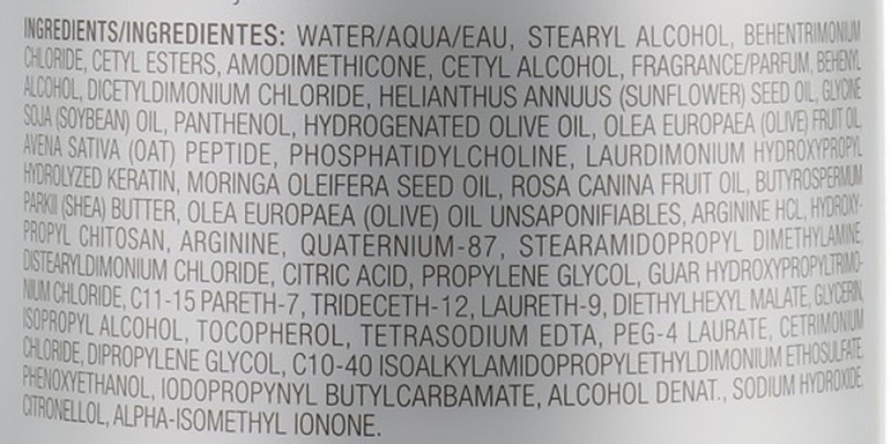 Склад: Water, Stearyl Alcohol, Behentrimonium Chloride, Cetyl Esters, Amodimethicone, Cetyl Alcohol, Fragrance, Behenyl Alcohol, Dicetyldimonium Chloride, Helianthus Annuus (Sunflower) Seed Oil, Glyone Soja (Soybean) Oil, Panthenol, Hydrogenated Olive Oil, Olea Europaea (Olive) Fruit Oil, Avena Sativa (Oat) Peptide, Phosphatidylcholine, Laurdimonium Hydroxypropyl Hydrolyzed Keratin, Moringa Oleifera Seed Oil, Rosa Canina Fruit Oil, Butyrospermum Parkii (Shea) Butter, Olea Europaea (Olive) Oil Unsaponifiables, Arginine HCL, Hydroxypropyl Chitosan, Arginine, Quaternium-87, Stearamidopropyl Dimethylamine Distearyldimonium Chloride, Citric Acid, Propylene Glycol, Guar Hydroxypropyltrimonium Chloride, C11-15 Pareth-7, Trideceth-12, Laureth-9, Diethylhexyl Malate, Glycerin, Isopropyl Alcohol, Tocopherol, Tetrasodium EDTA, PEG-4 Laurate, Cetrimonium Chloride, Dipropylene Glycol, C10-40 Isoalkylamidopropylethyldimonium Ethosulfate, Phenoxyethanol, Iodopropynyl Butylcarbamate, Alcohol Denat., Sodium Hydroxide, Citronellol, Alpha-Isomethyl Ionone