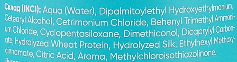 Склад: Aqua (Water), Dipalmitoylethyl Hydroxyethylmonium, Cetearyl Alcohol, Cetrimonium Chloride, Behenyl Trimethyl Ammonium Chloride, Cyclopentasiloxane, Dimethiconol, Dicaprylyl Carbonate, Hydrolyzed Wheat Protein, Hydrolyzed Silk, Ethylhexyl Methoxycinnamate, Citric Acid, Aroma, Methylchloroisothiazolinone.
