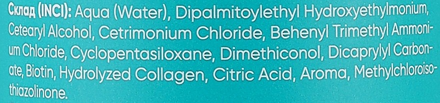 Склад: Aqua (Water), Dipalmitoylethyl Hydroxyethylmonium, Cetearyl Alcohol, Cetrimonium Chloride, Behenyl Trimethyl Ammonium Chloride, Cyclopentasiloxane, Dimethiconol, Dicaprylyl Carbonate, Biotin, Hydrolyzed Collagen, Citric Acid, Aroma, Methylchloroisothiazolinone.