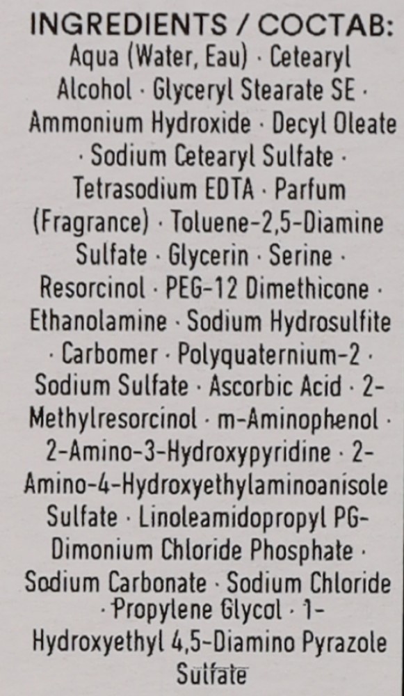 Склад: Aqua (Water, Eau), Cetearyl Alcohol, Glyceryl Stearate, Ammonium Hydroxide, Decyl Oleate, Sodium Cetearyl Sulfate, Tetrasodium EDTA, Parfum (Fragrance), Potassium Stearate, Glycerin, Ethanolamine, Toluene-2,5-Diamine Sulfate, Serine, PEG-12 Dimethicone, Ascorbic Acid, Sodium Hydrosulfite, 2-Methylresorcinol, Carbomer, Polyquaternium-2, Sodium Sulfate, 4-Chlororesorcinol, Resorcinol, 4-Amino-m-Cresol, Linoleamidopropyl PG-Dimonium Chloride Phosphate, PEG-14M, Sodium Chloride, Propylene Glycol, M-Aminophenol.