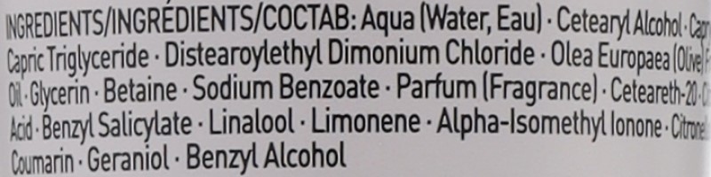 Склад: Aqua (Water, Eau), Cetearyl Alcohol, Capric Triglyceride, Distearoylethyl Dimonium Chloride, Olea Europaea (Olive Oil), Glycerin, Betaine, Sodium Benzoate, Parfum (Fragrance), Ceteareth-200, Acid, Benzyl Salicylate, Linalool, Limonene, Alpha-Isomethyl Ionone, Citrone, Coumarin, Geraniol, Benzyl Alcohol