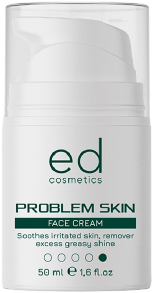 ED Cosmetics Problem Skin Face Cream, 50 ml — спеціалізований крем для догляду за шкірою з проявами акне, жирністю, розширеними порами та почервонінням. Розроблений для застосування в професійних програмах нормалізації шкіри та зниження себопродукції, а також як щоденний догляд для клієнтів зі схильною до запалень шкірою. Крем має заспокійливу, себорегулюючу та матуючу дію.