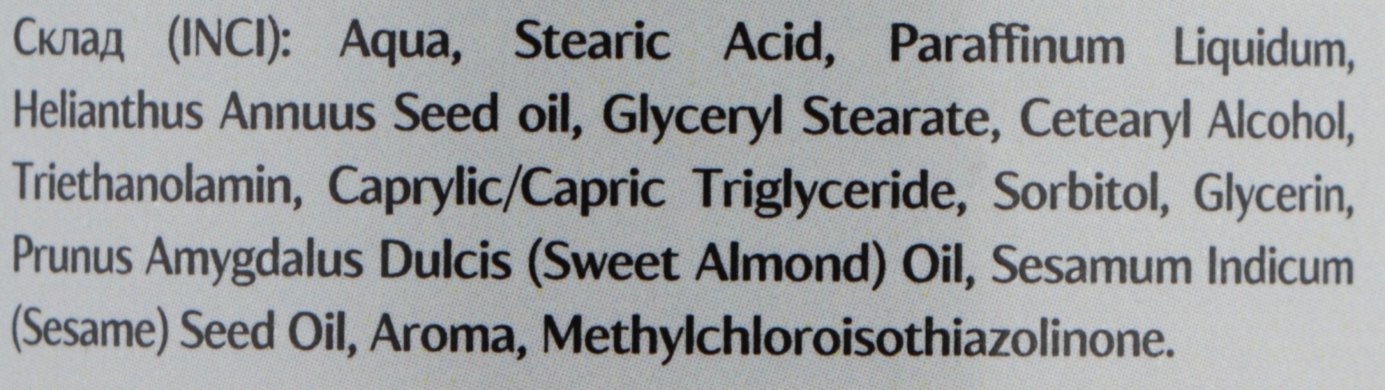 Склад: Water, Coconut oil, Cetearyl Alcohol, Glycerin, Emulsifier, Vaseline oil, Olive oil, Castor oil, Beeswax, Euperlan, Nipaguard BPX, Almond oil, D-Panthenol, Vitamin E, Natural fragrance