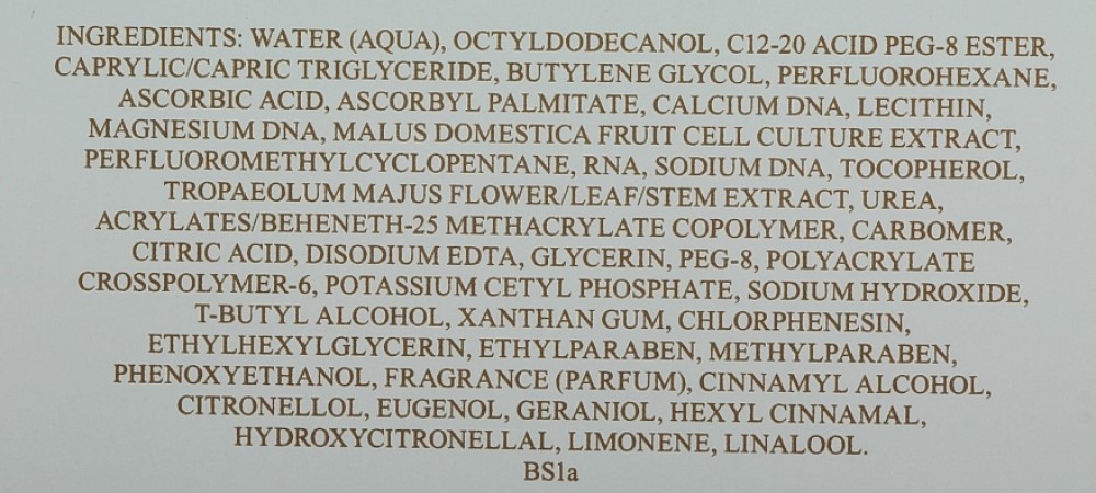 Склад: water, octyldodecanol, C12-20 acid PEG-8 ester, caprylic/capric triglyceride, butylene glycol, perfluorohexane, ascorbic acid, ascorbyl palmitate, calcium DNA, lecithin, magnesium DNA, malus domestica fruit cell culture extract, perfluoromethylcyclopentane, RNA, sodium DNA, tocopherol, tropaeolum majus flower/leaf/stem extract, urea, acrylates/beheneth-25 methacrylate copolymer, carbomer, citric acid, disodium EDTA, glycerin, PEG-8, polyacrylate crosspolymer-6, potassium cetyl phosphate, sodium hydroxide, t-butyl alcohol, xanthan gum, chlorphenesin, ethylhexylglycerin, ethylparaben, methylparaben, phenoxyethanol, fragrance, cinnamyl alcohol, citronellol, eugenol, geraniol, hexyl cinnamal, hydroxycitronellal, limonene, linalool