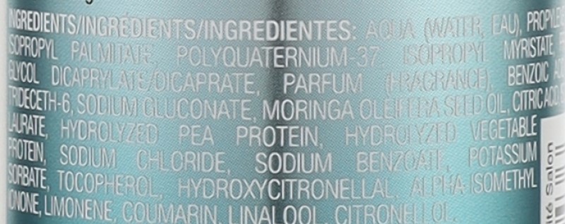 Склад: Aqua (Water, Eau), Propylene Glycol, Isopropyl Palmitate, Polyquaternium-37, Isopropyl Myristate, Propylene Glycol Dicaprylate/Dicaprate, Parfum (Fragrance), Benzoic Acid, PPG-1 Trideceth-6, Sodium Gluconate, Moringa Oleifera Seed Oil, Citric Acid, Hydrolyzed Pea Protein, Hydrolyzed Vegetable Protein, Sodium Chloride, Sodium Benzoate, Potassium Sorbate, Tocopherol, Hydroxycitronellal, Alpha-Isomethyl Ionone, Limonene, Coumarin, Linalool, Citronellol.
