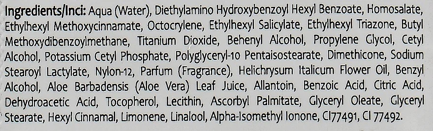 Склад: Комплекс UVA / UVB фільтрів, масло безсмертника, алое, алантоїн, вітамін Е, лецитин, диметикон, лимонна кислота, кориця, жиро і водорозчинна форма вітаміну С.