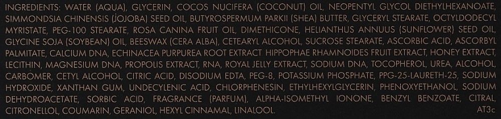 Склад: Water (aqua), Glycerin, Cocos Nucifera (coconut) Oil, Neopentyl Glycol Diethylhexanoate, Simmondsia Chinensis (jojoba) Seed Oil, Butyrospermum Parkii (shea) Butter, Glyceryl Stearate, Glyceryl Stearate, Glyceryl Stearate, ,helianthus Annuus (sunflower) Seed Oil, Glycine Soja (soybean) Oil, Beeswax (cera Alba), Cetearyl Alcohol, Sucroste Stearate, Ascorbic Activat, Ascorbyl Palmitate, Calcium Palmitate, Calcium Palmitate, Calcium Dna, Dna, Mel (honey) Extract, Propolis Extract, Rna, Royal Jelly Extract, Sodium Dna, Tocopherol, Urea, Alcohol, Carbomer, Cetyl Alcohol, Citric Acid, Disodium Edta, Peg-8, Potassium Ph 25, Sodium Hydroxide, Xanthan Gum, Chlorphenesin, Ethylhexylglycerin, Phenoxyethanol, Sodium Dehydroacetate, Sorbic Acid, Undecylenic Acid, Fragrance (parfum), Hexyl Ci.