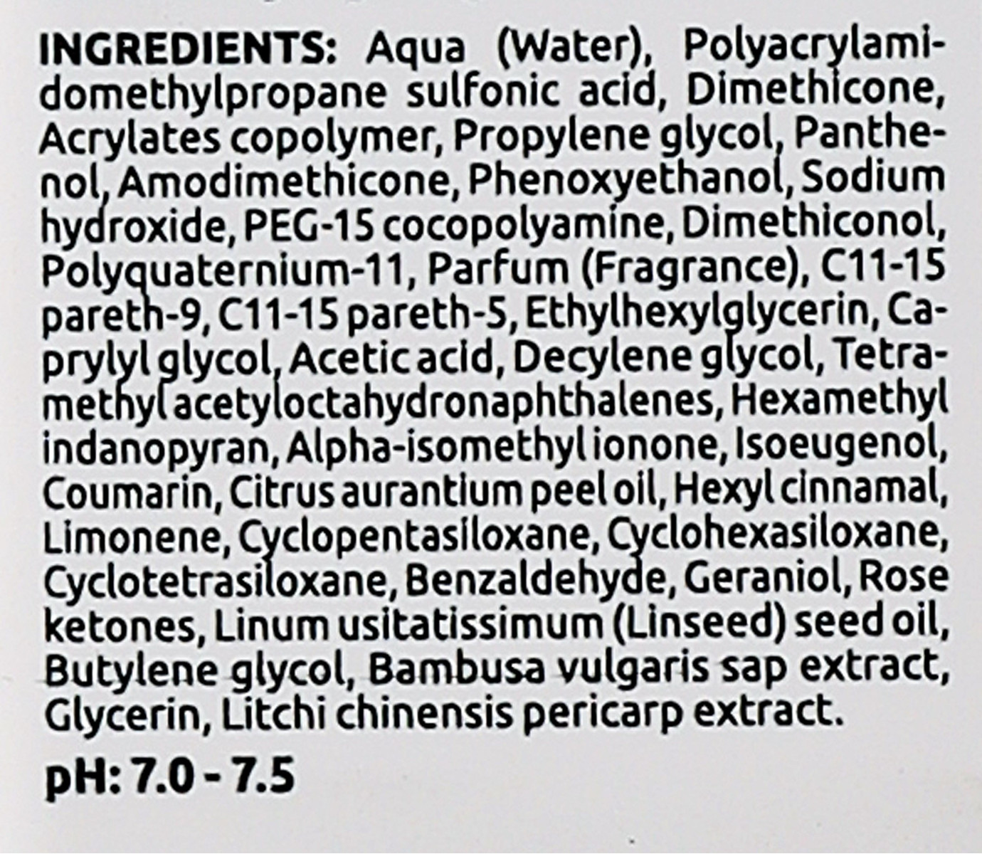 Склад: Aqua (Water), Polyacrylamidomethylpropane sulfonic acid, Dimethicone, Acrylates copolymer, Propylene glycol, Panthenol, Amodimethicone, Phenoxyethanol, Sodium hydroxide, PEG-15 cocopolyamine, Dimethiconol, Polyquaternium-11, Parfum (Fragrance), C11-15 pareth-9, C11-15 pareth-5, Ethylhexylglycerin, Caprylyl glycol, Acetic acid, Decylene glycol, Tetramethylacetyloctahydronaphthalenes, Hexamethyl indanopyran, Alpha-isomethyl ionone, Isoeugenol, Coumarin, Citrus aurantium peel oil, Hexyl cinnamal, Limonene, Cyclopentasiloxane, Cyclohexasiloxane, Cyclotetrasiloxane, Benzaldehyde, Geraniol, Rose ketones, Linum usitatissimum (Linseed) seed oil, Butylene glycol, Bambusa vulgaris sap extract, Glycerin, Litchi chinensis pericarp extract