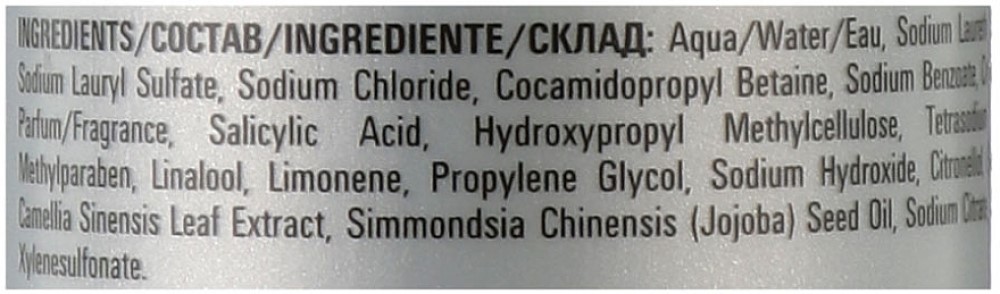 Склад: Aqua/Water/Eau, Sodium Laureth Sulfate, Sodium Lauryl Sulfate, Sodium Chloride, Cocamidopropyl Betaine, Sodium Benzoate, Citric Acid, Parfum/Fragrance, Salicylic Acid, Hydroxypropyl Methylcellulose, Tetrasodium Edta, Methylparaben, Linalool, Limonene, Propylene Glycol, Sodium Hydroxide, Citronellol, Geraniol, Camellia Sinensis Leaf Extract, Simmondsia Chinensis (Jojoba) Seed Oil, Sodium Citrate, Sodium Xylenesulfonate.