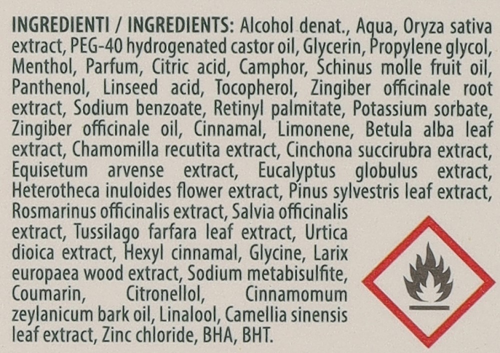 Склад: Aqua, Alcohol denat., PEG-40 hydrogenated castor oil, Glycerin, Oryza sativa extract, Propylene glycol, Menthol, Parfum, Citric acid, Camphor, Panthenol, Linseed acid, Tocopheryl acetate, Zingiber officinale root extract, Retinyl palmitate, Zingiber officinale oil, Sodium benzoate, Cinnamal, Betula alba leaf extract, Chamomilla recutita extract, Cinchona succirubra extract, Equisetum arvense extract, Eucalyptus globulus extract, Heterotheca inuloides flower extract, Pinus sylvestris leaf extract, Rosmarinus officinalis extract, Salvia officinalis extract, Tussilago farfara leaf extract, Urtica dioica extract, Potassium sorbate, Schinus molle fruit oil, Hexyl cinnamal, Limonene, Glycine, Larix europaea wood extract, Sodium metabisulfite, Coumarin, Citronellol, Cinnamomum zeylanicum bark oil, Sodium hydroxide, Linalool, Camellia sinensis leaf extract, Zinc chloride, BHA, BHT.
