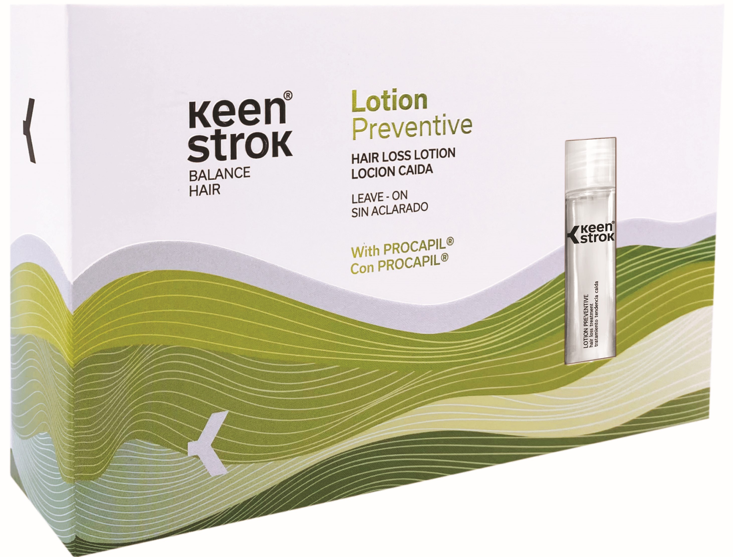 Лосьйон для профілактики випадіння волосся Keen Strok зміцнює та омолоджує волосяні фолікули, запобігаючи їх випадінню, як у чоловіків, так і у жінок. Він сприяє зміцненню волосся, посилюючи метаболізм та структуру волосяних фолікулів. Формула містить олеанолову кислоту, яка пригнічує 5α-редуктазу, апігенін покращує мікроциркуляцію крові в шкірі голови, а біотинілат-GHK стимулює клітинний метаболізм.