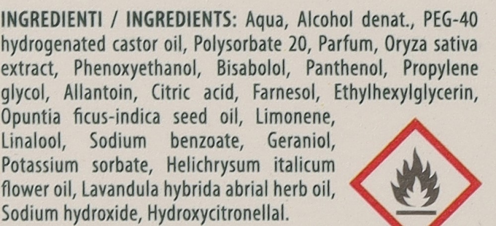 Склад: Aqua, Alcohol denat., PEG-40 hydrogenated castor oil, Polysorbate 20, Parfum, Oryza sativa extract, Phenoxyethanol, Bisabolol, Panthenol, Propylene glycol, Allantoin, Citric acid, Farnesol, Ethylhexylglycerin, Opuntia ficus-indica seed oil, Limonene, Linalool, Sodium benzoate, Geraniol, Potassium sorbate, Helichrysum italicum flower oil, Lavandula hybrida abrial herb oil, Sodium hydroxide, Hydroxycitronellal
