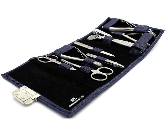 Склад набору: пилочка, кніпсер, ножиці для кутикули, ножиці для нігтів, пінцет, скребок для п'ят, кусачки для обрізання шкіри (кутикули), кусачки для педикюру, кусачки врослого нігтя.