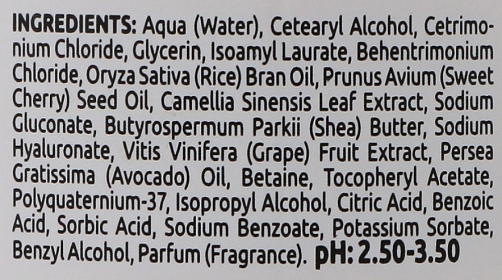 Склад: Aqua (Water), Cetearyl Alcohol, Cetrimo- nium Chloride, Glycerin, Isoamyl Laurate, Behentrimonium Chloride, Oryza Sativa (Rice) Bran Oil, Prunus Avium (Sweet Cherry) Seed Oil, Camellia Sinensis Leaf Extract, Sodium Gluconate, Butyrospermum Parkii (Shea) Butter, Sodium Hyaluronate, Vitis Vinifera (Grape) Fruit Extract, Persea Gratissima (Avocado) Oil, Betaine, Tocopheryl Acetate, Polyquaternium-37, Isopropyl Alcohol, Citric Acid, Benzoic Acid, Sorbic Acid, Sodium Benzoate, Potassium Sorbate, Benzyl Alcohol, Parfum (Fragrance).