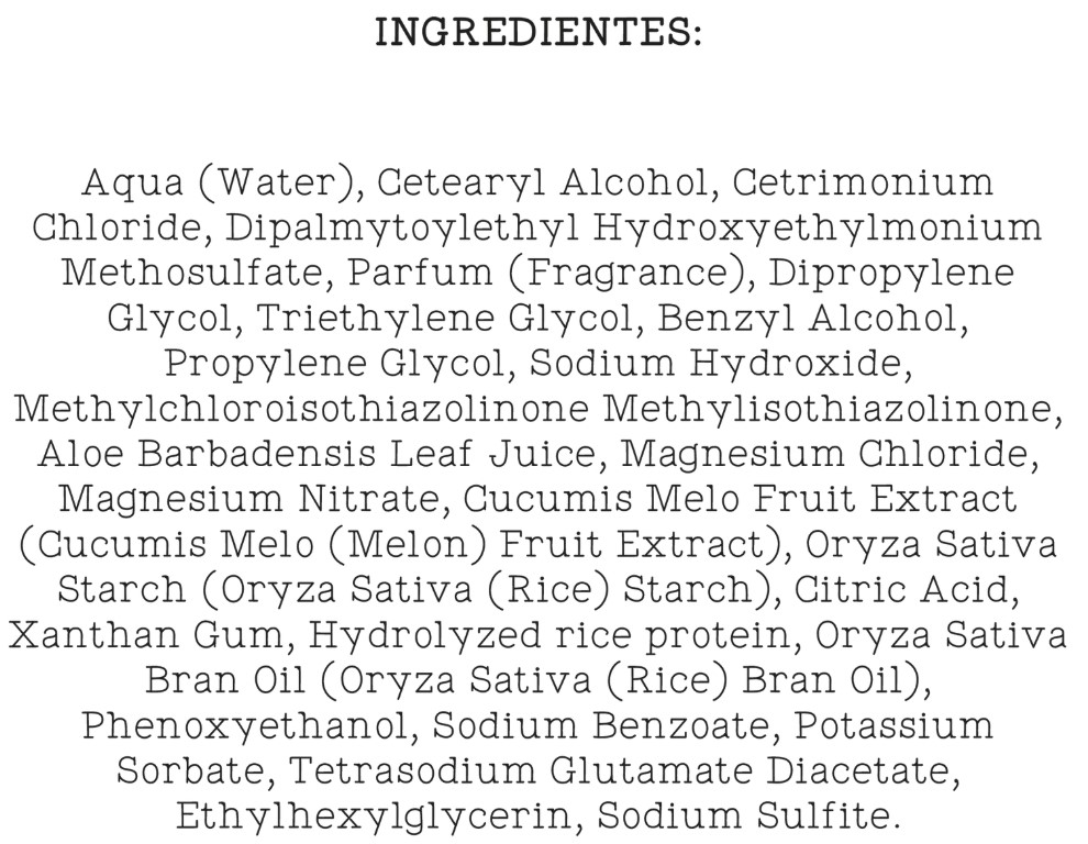 Склад: Aqua (Water), Cetearyl Alcohol, Cetrimonium Chloride, Dipalmytoylethy Hydoryethylmonium Methosulfate, Parfum (Fragrance), Dipropylene Glycol, Triethylene Glycol, Benzyl Alcohol, Propylene Glycol, Sodium Hydroxide, Methylchloroisothiazolinone & Methylisothiazolinone, Aloe Barbadensis Leaf Juice, Magnesium Chloride, Magnesium Nitrate, Cucumis Melo Fruit Extract (Cucumis Mel (Melon) Fruit Extract), Oryza Sativa Starch (Oryza Sativa (Rice) Starch), Citric Acid, Xanthan Gum Hydrolyzed rice protein, Oryza Sativa Bran Oil (Oryza Sativa (Rice) Bran Oil, Phenoxyethanol, Sodium Benzoate, Potassium Sorbate, Tetrasodium Glutamate Diacetate, Ethylhexylglycerin.Sodium Sulfite