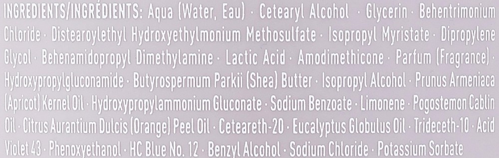 Склад: Aqua (Water, Eau), Cetearyl Alcohol, Glycerin, Behentrimonium Chloride, Distearoylethyl Hydroxyethylmonium Methosulfate, Isopropyl Myristate, Parfum (Fragrance), Behenamidopropyl Dimethylamine, Lactic Acid, Amodimethicone, Hydroxypropylgluconamide, Butyrospermum Parkii (Shea) Butter, Citrus Aurantium Peel Oil, Isopropyl Alcohol, Limonene, Prunus Armeniaca (Apricot) Kernel Oil, Hydroxypropylammonium Gluconate, Sodium Benzoate, Ceteareth-20, Pogostemon Cablin Oil, Eucalyptus Globulus Oil, Trideceth-10, Acid Violet 43, Phenoxyethanol, HC Blue No. 12, Benzyl Alcohol, Sodium Chloride, Potassium Sorbate