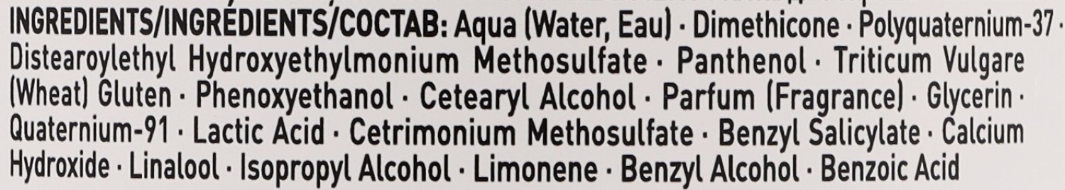 Склад: Aqua (Water, Eau) · Dimethicone · Polyquaternium-37 · Distearoylethyl Hydroxyethylmonium Methosulfate · Hydrolyzed Keratin· Steardimonium Hydroxypropyl Hydrolyzed Keratin· Panthenol· Hydrolyzed Silk· Calcium Hydroxide· Cetearyl Alcohol· Isopropyl Alcohol· Butylene Glycol· Methyl Benzoate · Lactic Acid · Phenoxyethanol · Cetrimonium Methosulfate · Potassium Sorbate · Mica · Linalool· Hexyl Cinnamal· Limonene · Citronellol· Geraniol· Benzyl Alcohol · Parfum (Fragrance) · Benzyl Salicylate · Quaternium-91 · Coumarin · Methylparaben · Propylparaben · CI 77891 (Titanium Dioxide) · CI 17200 (Red 33)