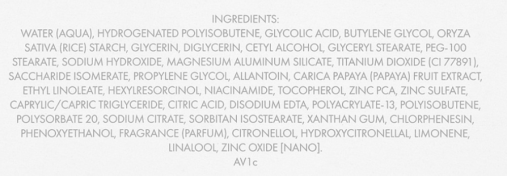 Склад: Water (Aqua), Hydrogenated Polyisobutene, Glycolic Acid, Butylene Glycol, Oryza Sativa (Rice) Starch, Glycerin, Diglycerin, Cetyl Alcohol, Glyceryl Stearate, Peg-100 Stearate, Sodium Hydroxide, Magnesium Aluminum Silicate, Titanium Dioxide (Ci 77891), Saccharide Isomerate, Propylene Glycol, Allantoin, Carica Papaya (Papaya) Fruit Extract, Ethyl Linoleate, Hexylresorcinol, Niacinamide, Tocopherol, Zinc Pca, Zinc Sulfate, Caprylic/Capric Triglyceride, Citric Acid, Disodium Edta, Polyacrylate-13, Polyisobutene, Polysorbate 20, Sodium Citrate, Sorbitanisostearate Xanthan Gum, Chlorphenesin, Phenoxyethanol, Fragrance (Papfum) Citronellol, Hydroxycitronellal, Limonene, Oxide Naino]