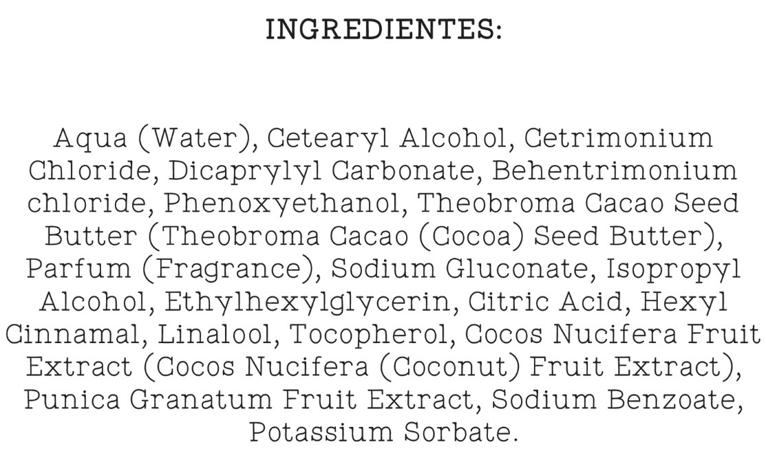 Склад: Aqua (Water), Cetearyl Alcohol, Seed Butter, Dicaprylyl Carbonate, Behentrimonium chloride, Phenoxyethanol, Theobroma Cacao Seed Butter (Theobroma Cacao (Cocoa) Seed Butter), Parfum (Fragrance), Linalool, Tocopherol, Cocos Nucifera Fruit Extract (Cocos Nucifera (Coconut) Fruit Extract), Punica Granatum Fruit Extract, Sodium Benzoate, Potassium Sorbate