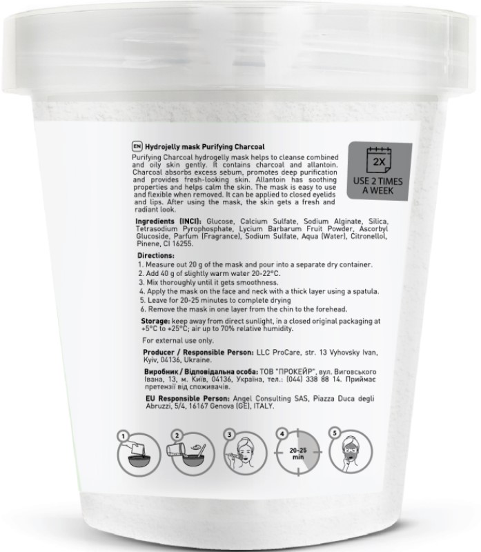 Унікальна гідрогелева маска Purifying Charcoal ефективно очистить шкіру і поверне їй здорове сяйво. Має вигляд порошку з активним компонентом - вугіллям, при контакті з водою перетворюється в однорідну густу гідрогелеву консистенцію. Маска застигає, а її компоненти починають активно діяти, проникаючи в глибинні шари епідермісу.