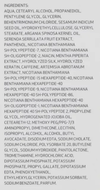 Засіб для профілактики випадання волосся з активними речовинами, які проникають безпосередньо в цибулину волосся, завдяки нанотехнологіям, сполуки, інкапсульовані в ліпосоми для харчування, підвищують міцність капілярів, запобігаючи випаданню волосся. Зволоження, відновлення, стимуляції росту, поліпшення кровообігу та зміцнення імунної системи. Склад: екстракт артеміди, сереноа серрулату, гідролізований кератин, гідролізований шовк, кофеїн, екстракт ментолу, фактори росту.