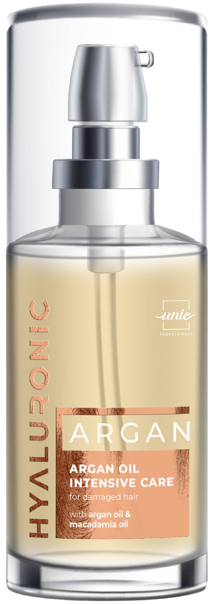 Масло Unic Hyaluronic Argan - інтенсивний догляд для пошкодженого волосся з аргановою олією та маслом макадамії. Це глибоке живлення, відновлення та захист сухого та пошкодженого волосся. Легка текстура не обтяжує. Підходить для регулярного використання. Достатньо кількох крапель – і результат помітний вже після першого нанесення.