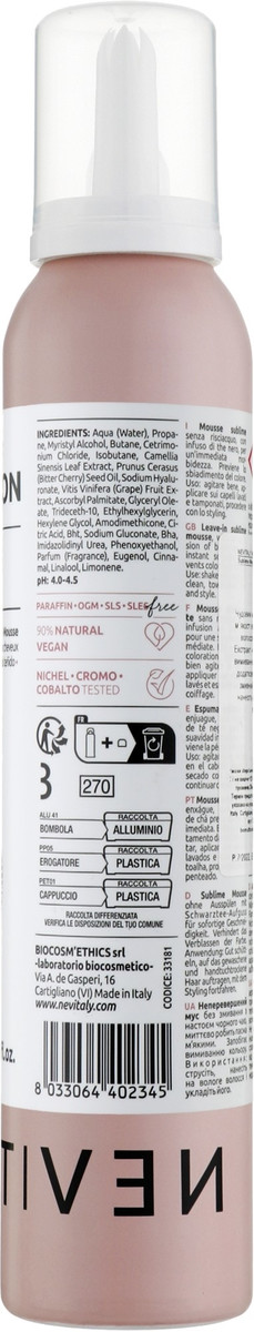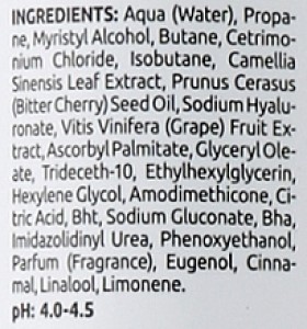 Склад: Aqua (Water), Propane, Myristyl Alcohol, Butane, Cetrimonium Chloride, Isobutane, Camellia Sinensis Leaf Extract, Prunus Cerasus (Bitter Cherry) Seed Oil, Sodium Hyaluronate, Vitis Vinifera (Grape) Fruit Extract, Ascorbyl Palmitate, Glyceryl Oleate, Trideceth-10, Ethylhexylglycerin, Hexylene Glycol, Amodimethicone, Citric Acid, BHT, Sodium Gluconate, BHA, Imidazolidinyl Urea, Phenoxyethanol, Parfum (Fragrance), Eugenol, Cinnamal, Linalool, Limonene.